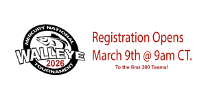 Reminder that registration for the 48th Annual Mercury National Walleye Tournament in 2026 will open March 9th, 2026 at 9AM CT. Call your buddies remind them to get in. There is a 300 team limit!